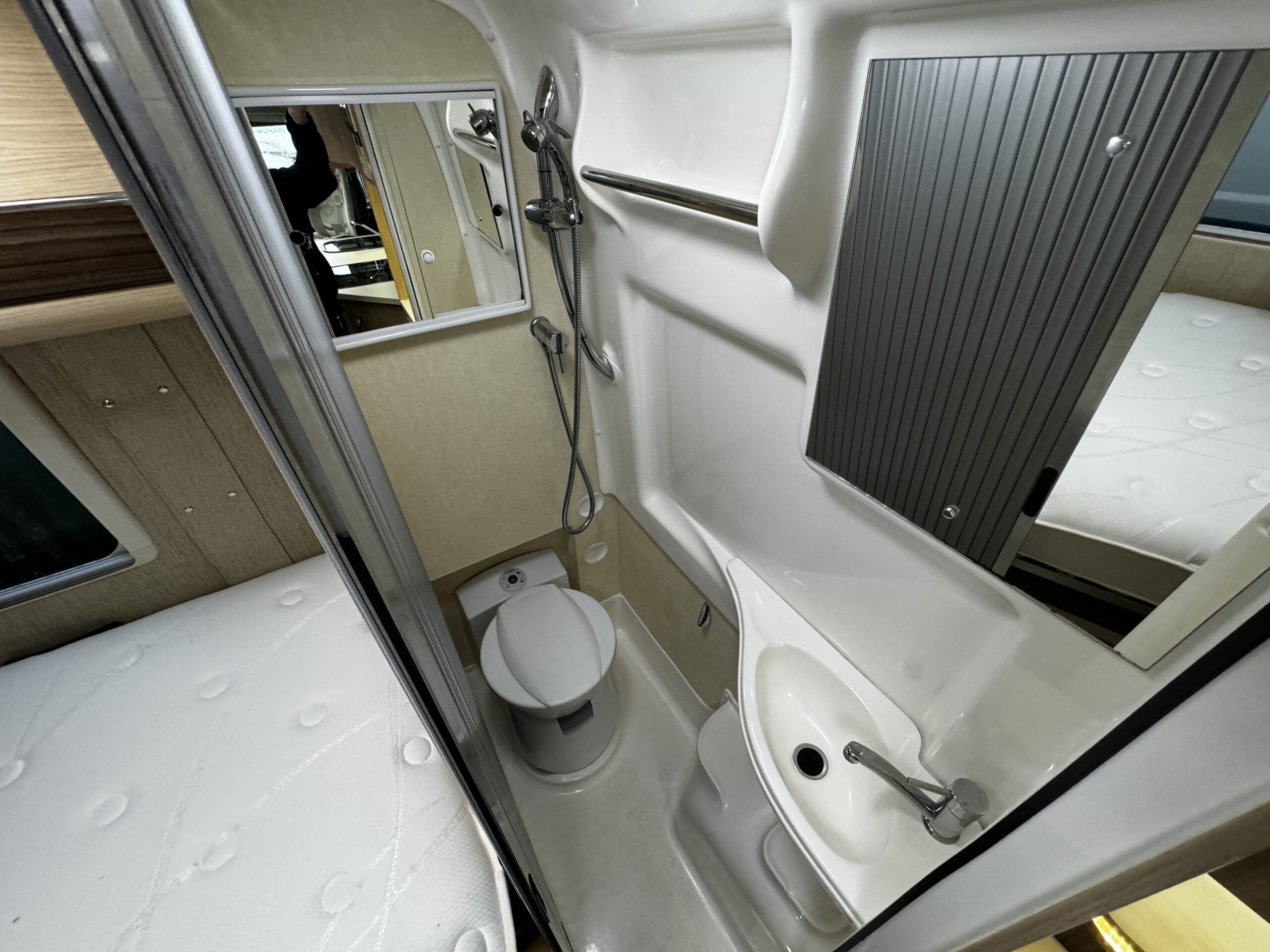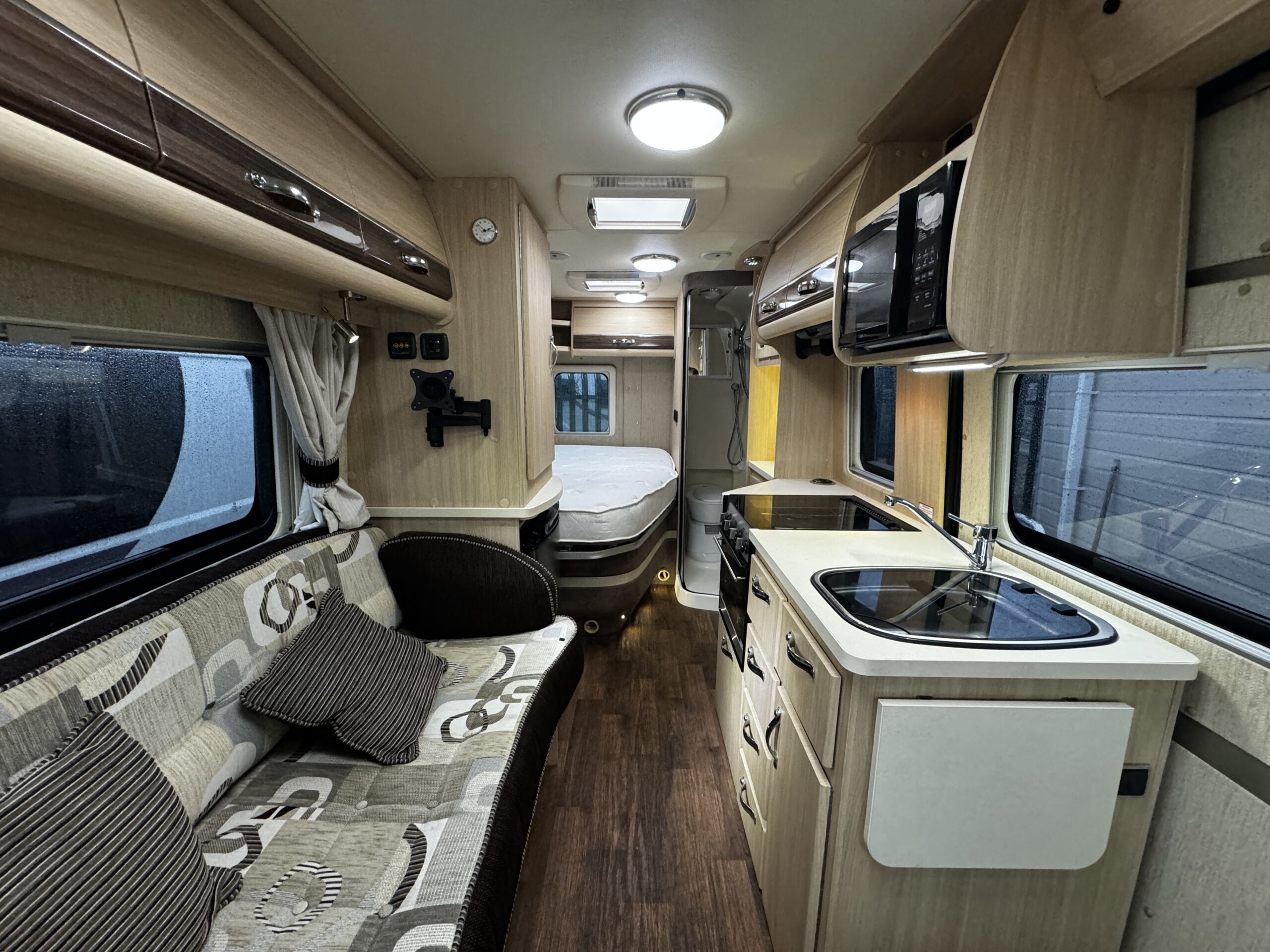 The layout features a bright and comfortable front lounge, a well-equipped central kitchen, and a fixed French bed leading through to a spacious end washroom, creating a well-balanced and practical living space ideal for extended trips.
