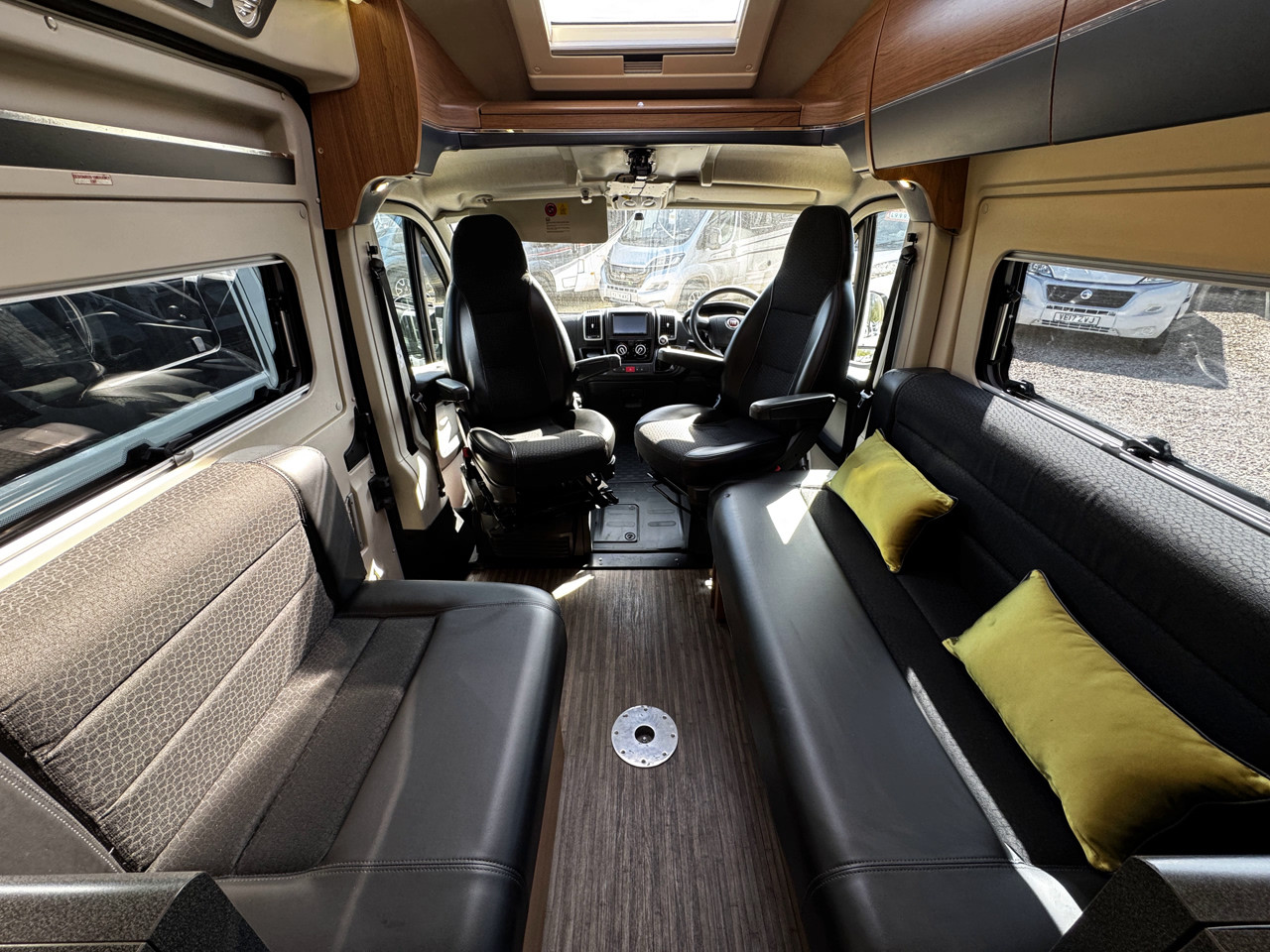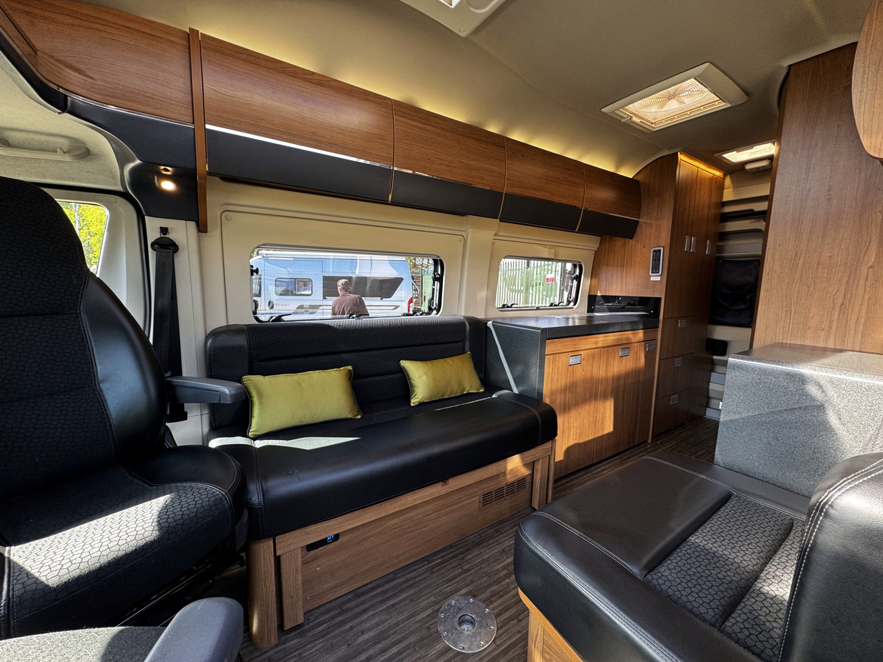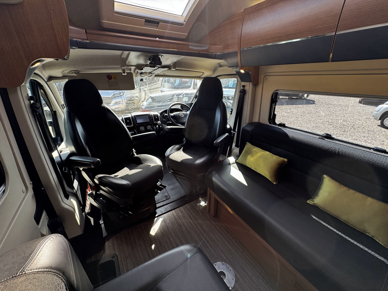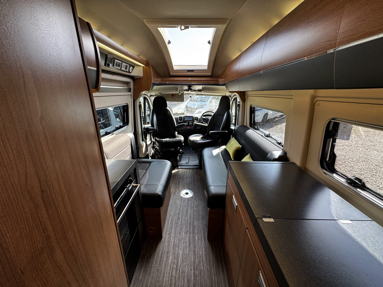 The layout features twin side settees, creating a bright and sociable lounge area that easily converts into a comfortable sleeping space. The interior is finished with leather-type upholstery, giving the van a modern and premium feel, while the compact size makes it ideal for both everyday use and touring.