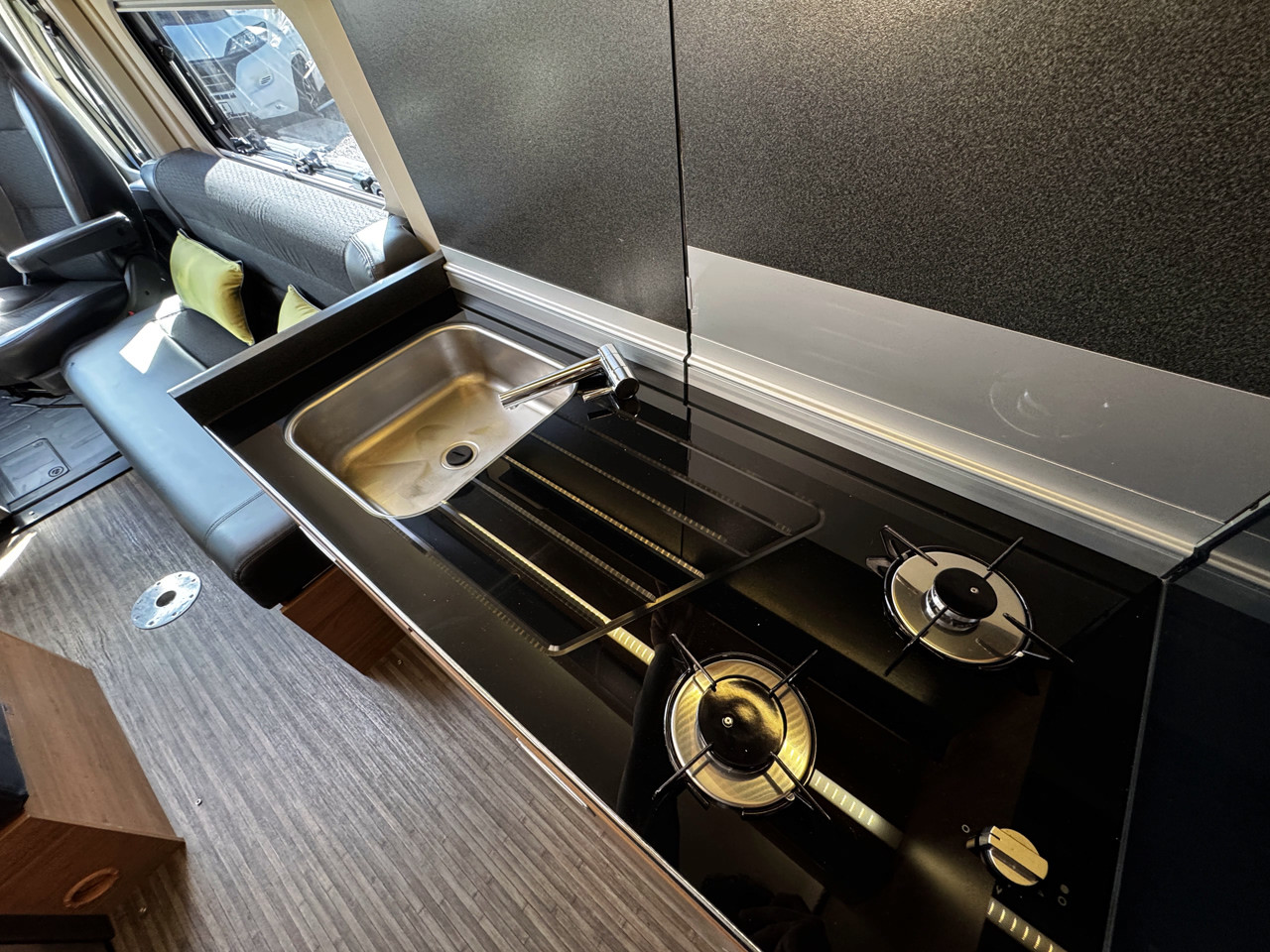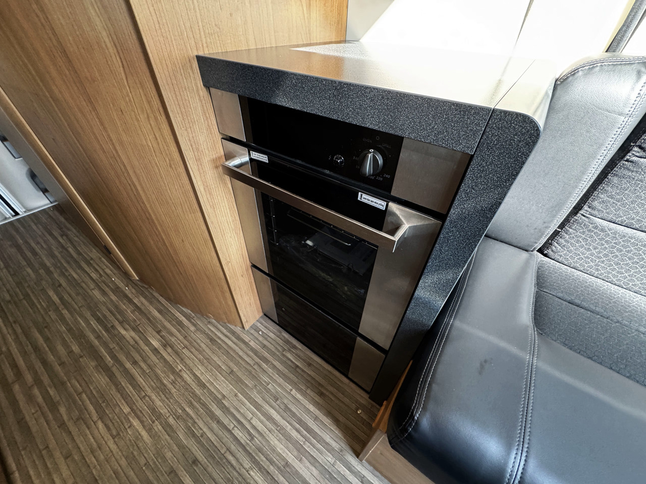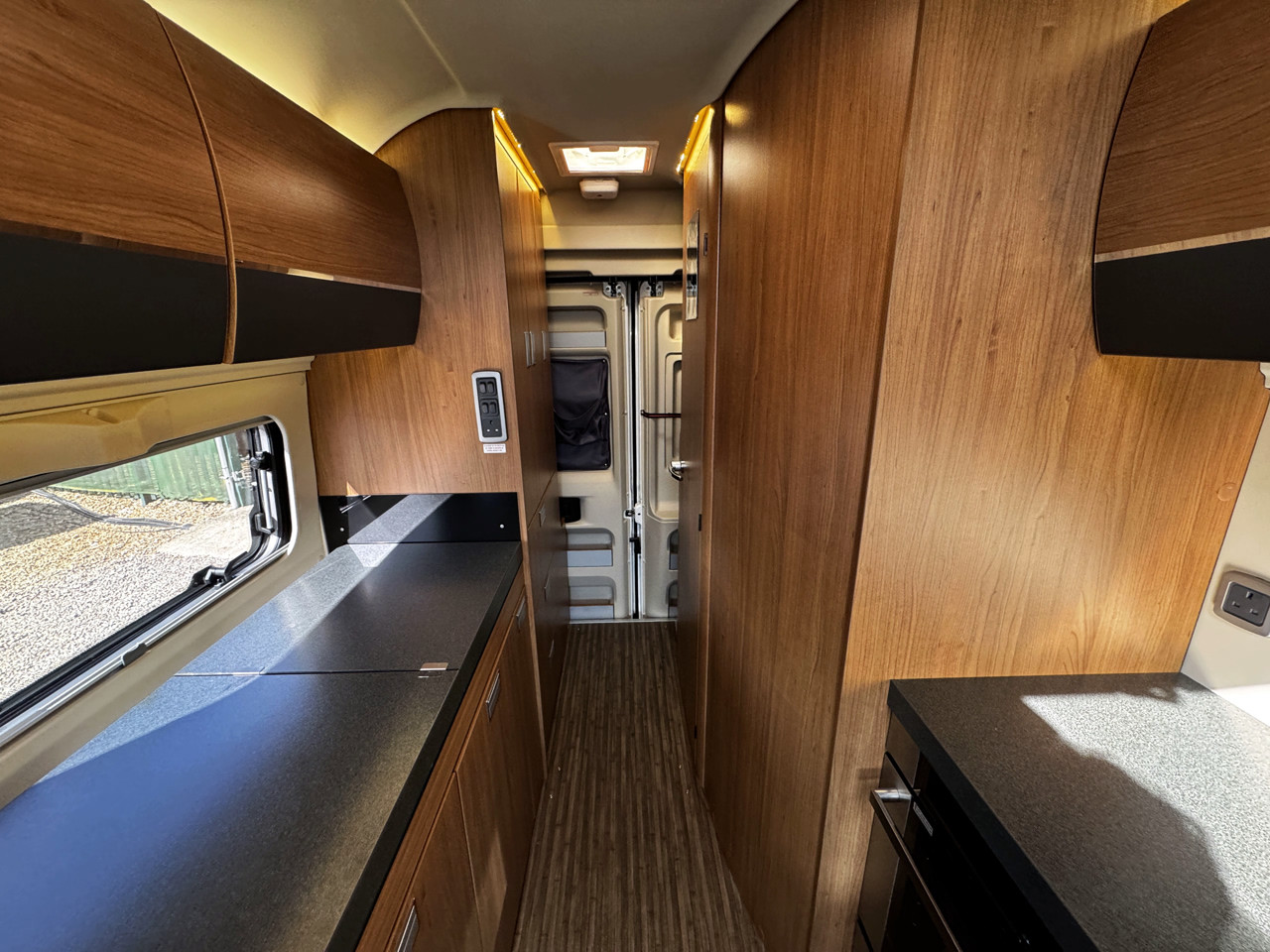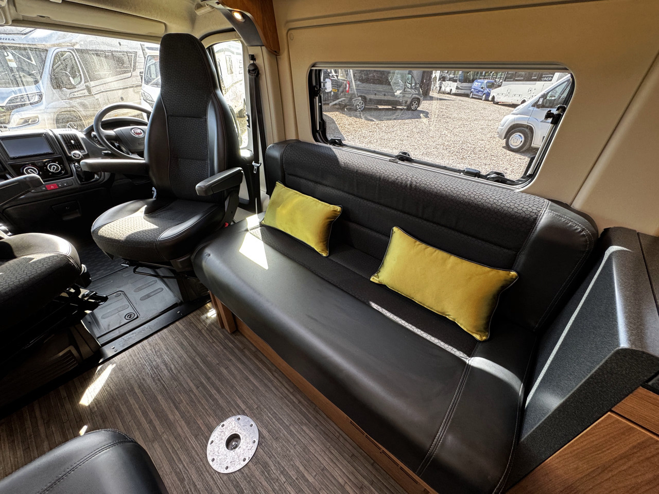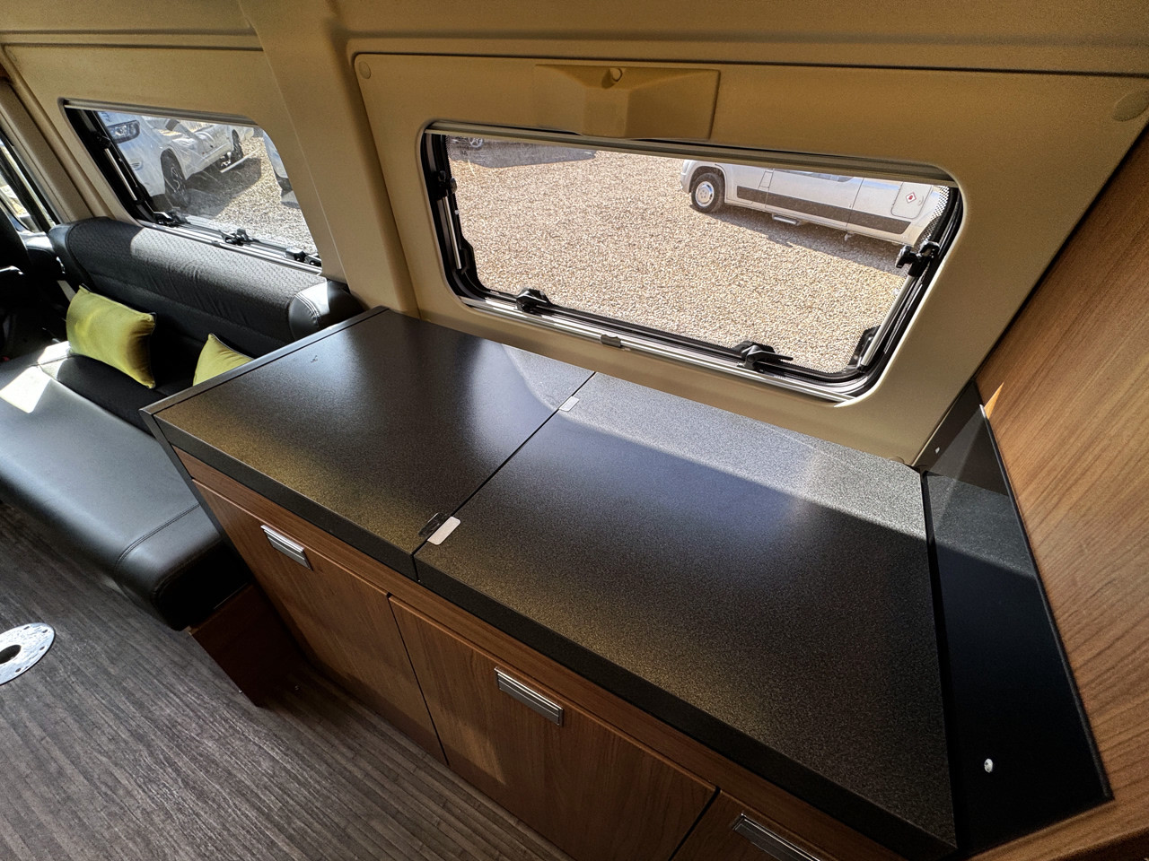 The layout features twin side settees, creating a bright and sociable lounge area that easily converts into a comfortable sleeping space. The interior is finished with leather-type upholstery, giving the van a modern and premium feel, while the compact size makes it ideal for both everyday use and touring.