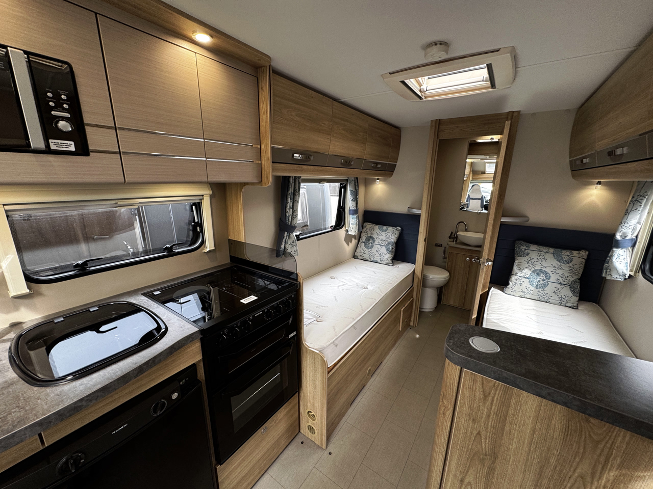 The layout features front side settees with fold-up travel seats, creating a flexible and sociable living space, along with low rear single beds for easy access and comfort. To the rear, a full-width washroom provides a generous space with separate shower facilities—creating a practical and comfortable setup for extended trips.