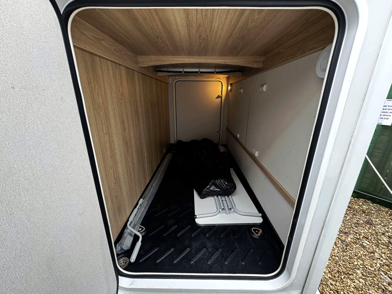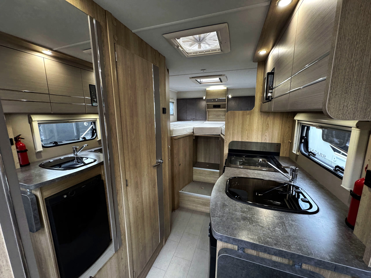 The layout features front side settees with fold-up travel seats, creating a flexible and sociable living space, along with rear single beds that can be converted into a large double using the infill section. Beneath, a huge rear garage provides exceptional storage space, making it perfect for carrying bikes or additional equipment for extended trips.