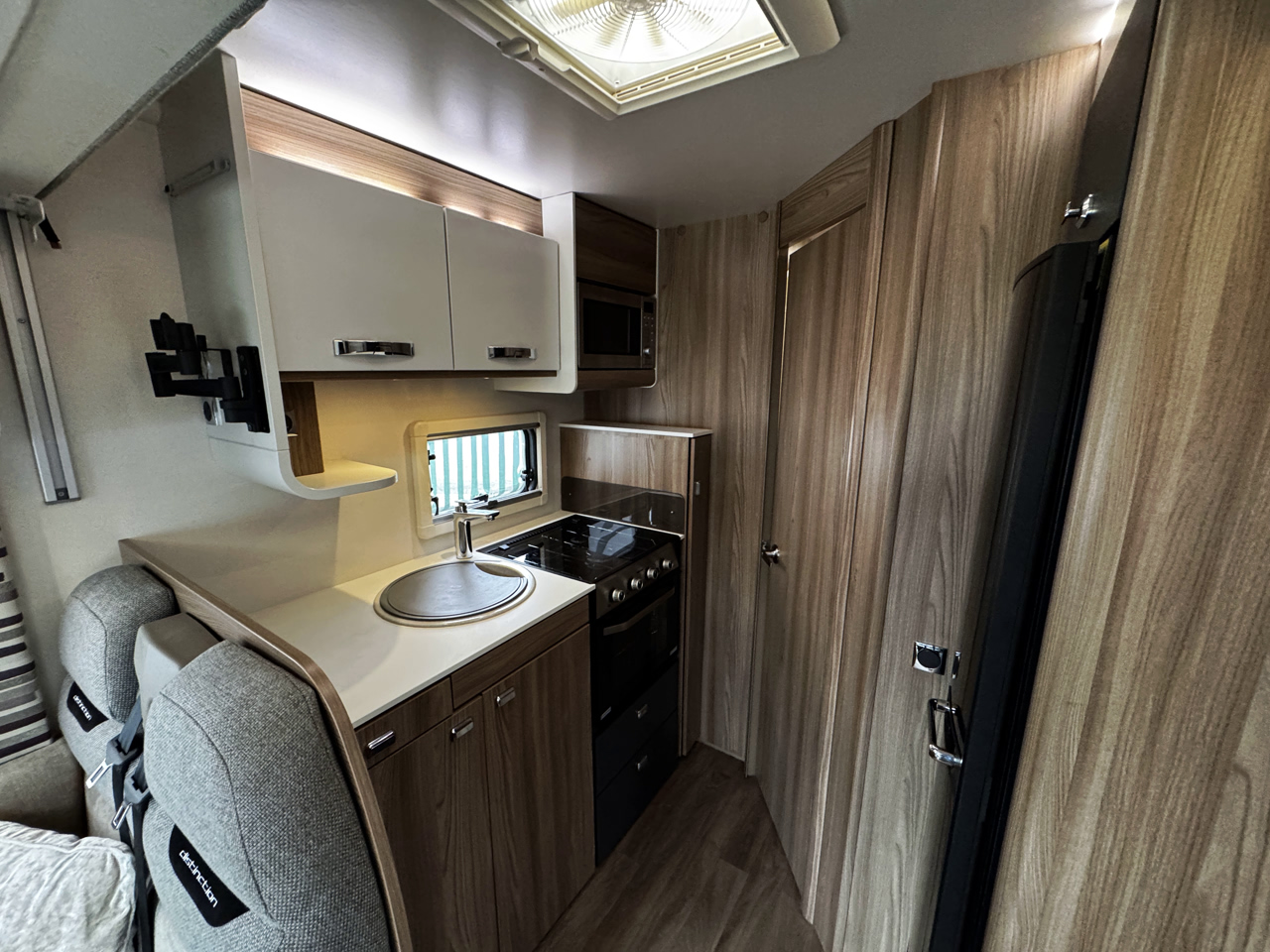 The layout features a bright and comfortable front lounge, a well-equipped central kitchen, and a full-width rear washroom, providing a generous space with separate shower facilities—creating a practical and comfortable setup for extended trips.
